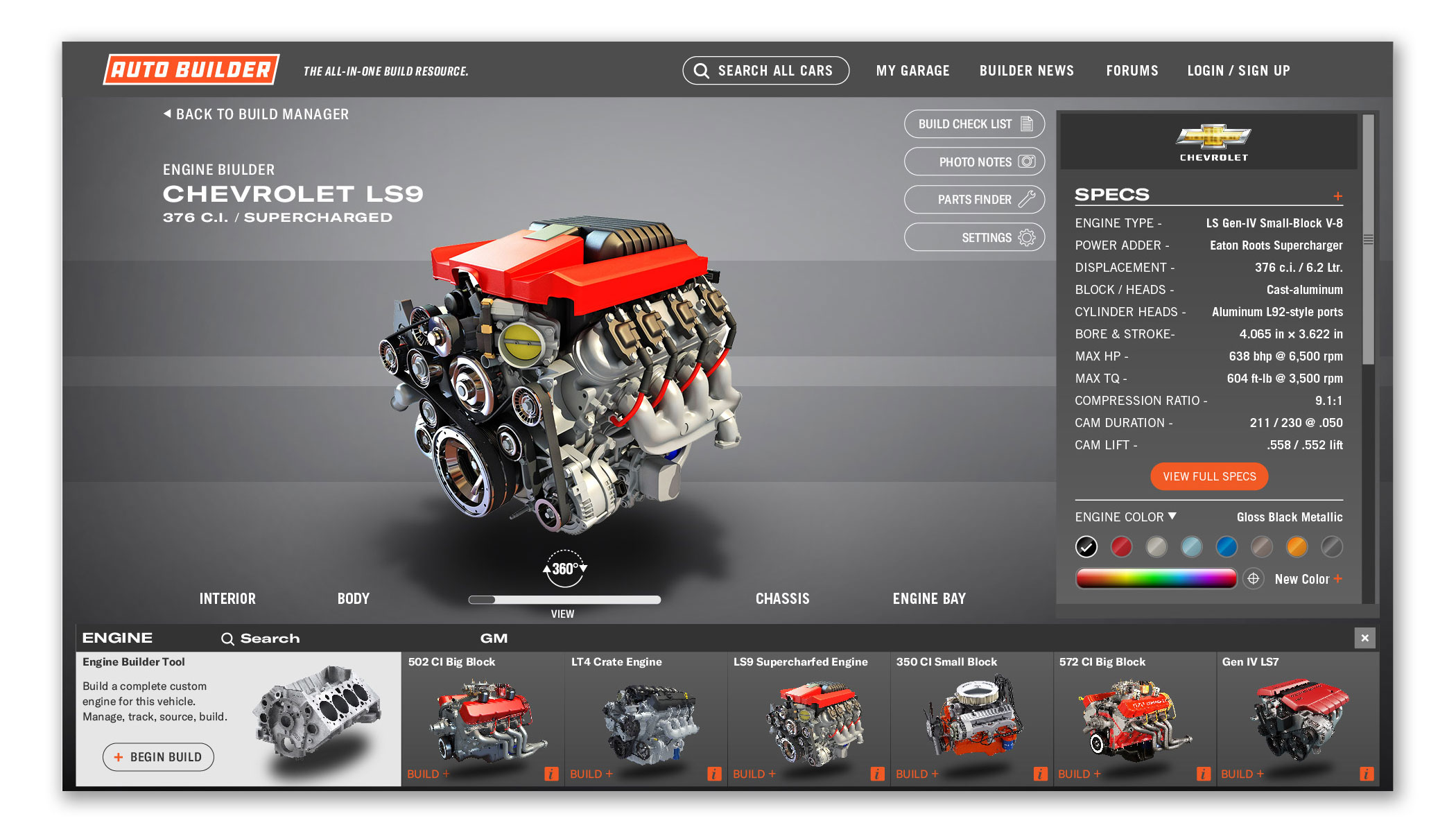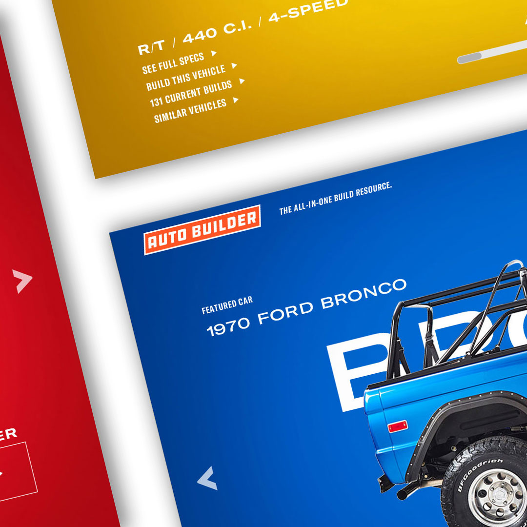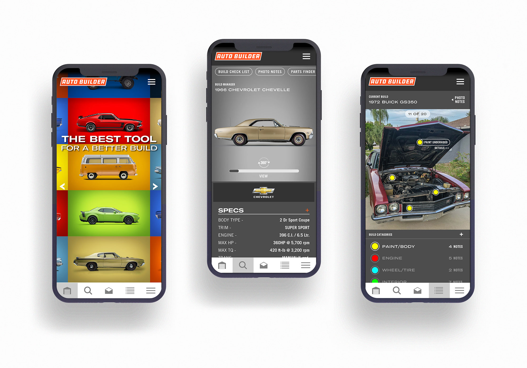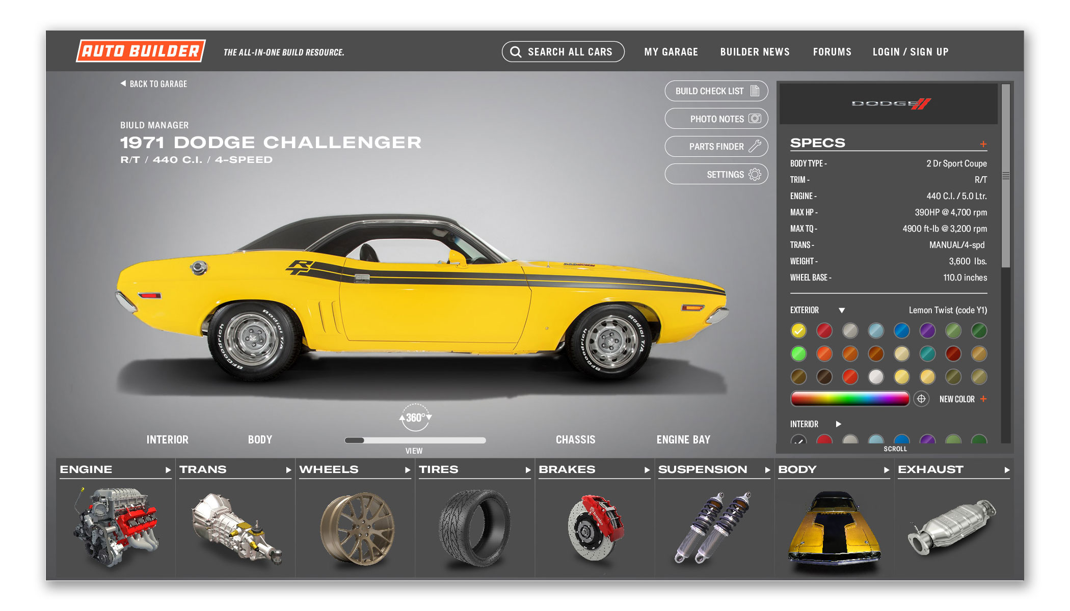 Auto Builder utilizes thousands of high quality 3D vehicle renderings, wheels, tires, engines, and parts to customize your build. Change the exterior and interior to any color. Try on wheels or swap in a different engine. You can view your vehicle’s specs, add notes, upload photos, find parts, and you can keep track of multiple builds at once. And since most of us builders are tight on space, tight on time, and tight on budget, this is one tool that can really make a difference. Think of it as project management built for automotive builders and restorers — professional or weekend warrior.