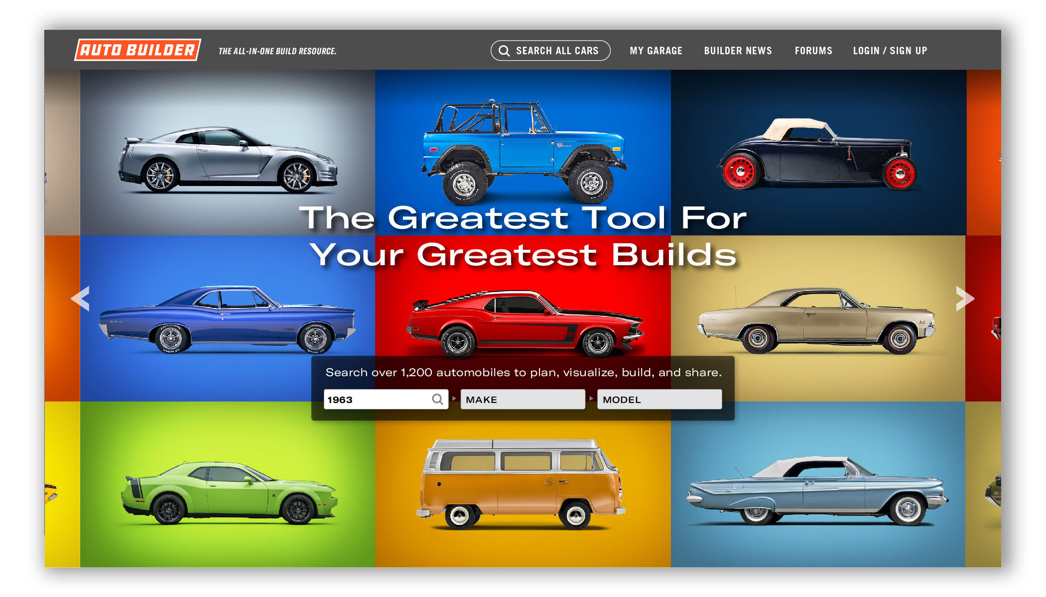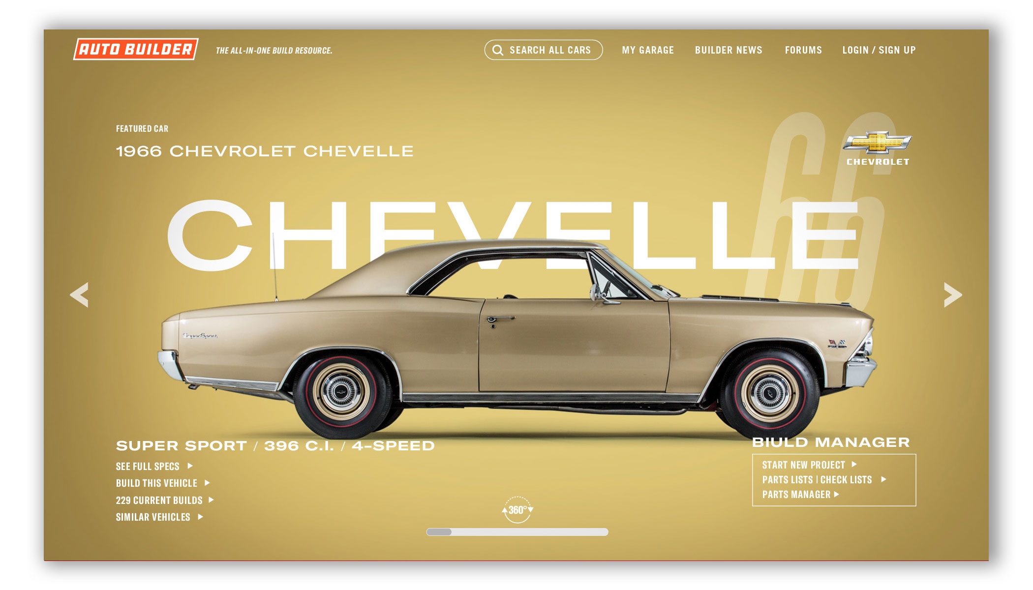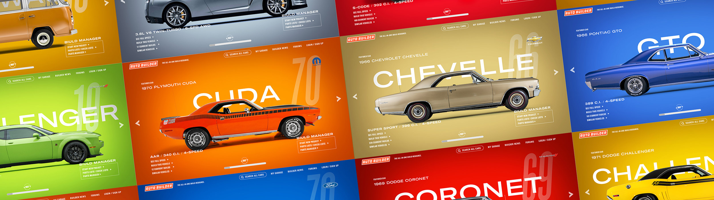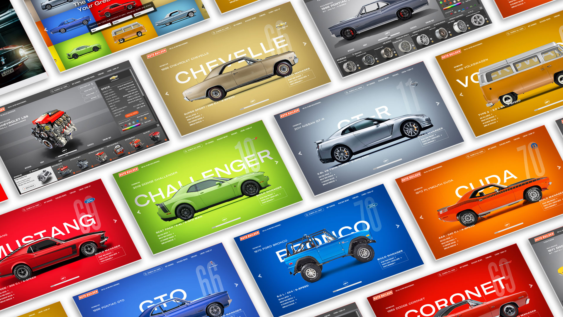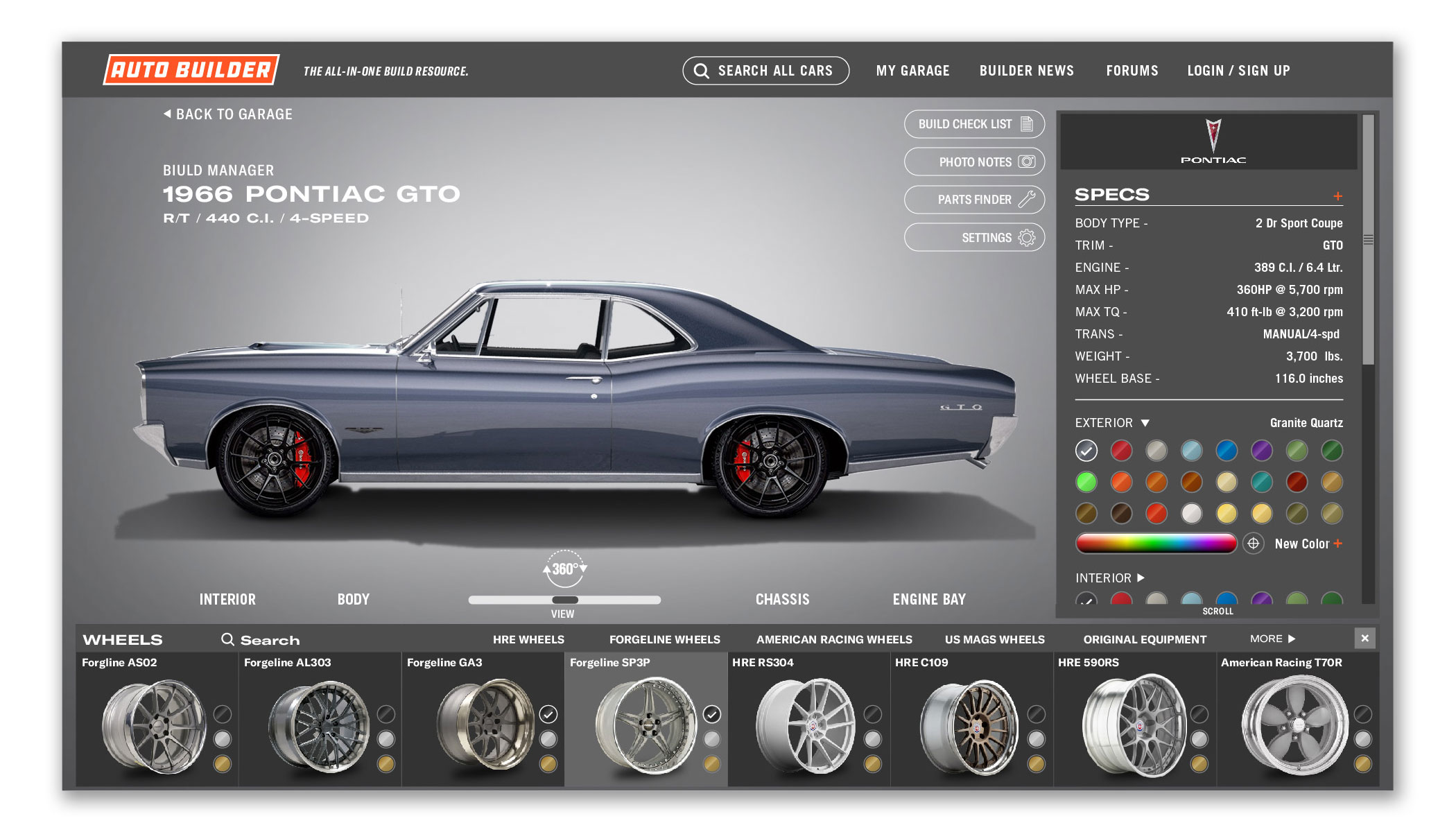Auto Builder utilizes thousands of high quality 3D vehicle renderings, wheels, tires, engines, and parts to customize your build. Change the exterior and interior to any color. Try on wheels or swap in a different engine. You can view your vehicle’s specs, add notes, upload photos, find parts, and you can keep track of multiple builds at once. And since most of us builders are tight on space, tight on time, and tight on budget, this is one tool that can really make a difference. Think of it as project management built for automotive builders and restorers — professional or weekend warrior.