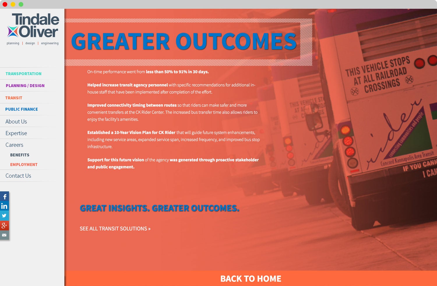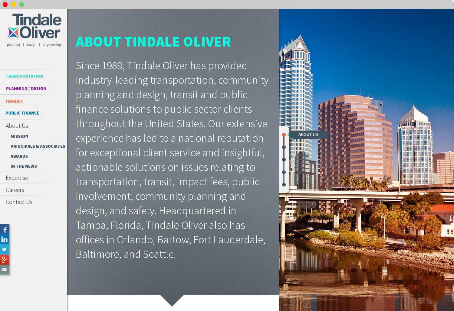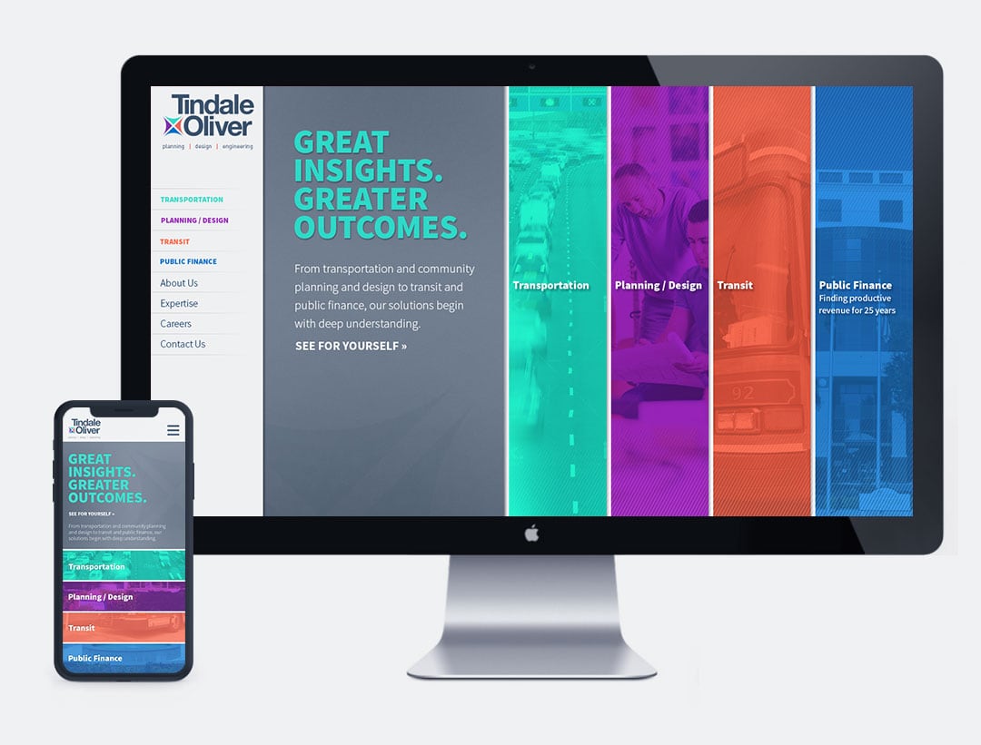 Tindale Oliver is an award winning planning, design and engineering firm with a national reputation, and they needed their brand to help them compete at a national level. To help their innovative business grow successfully, Tindale Oliver shows how insight and experience lead to better outcomes. The rebranding efforts were focused on this intersection, as well as the expertise in their 4 services, which were key contributing ideas in creating the new logo and brand identity. The new website allows visitors to explore case studies for each of the services that show how multiple, and specific insights lead to innovative outcomes.