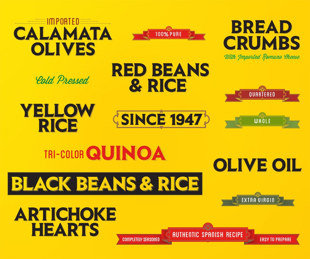 When I got the opportunity to re-design the packaging for the most famous Yellow Rice in the country, the brand I bought on a weekly basis, I was excited. I knew that Vigo was an estabished brand with a lot of equity, even at a glance with it's bright yellow glow. The problem that needed to be solved was how to unifying 100s of products, classing it up with smart design, and not illiminating the equity built by decades of quality. Another hurdle to pass was getting the product on the label. On every label, and shot in a way that would be unique to the brand and work across the product line. Even the main font was created custom for the brand. This was a huge endevor for me that will hopefully last another 50 years for Vigo.